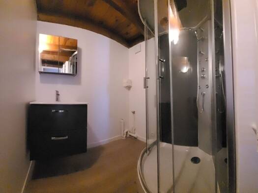 Grand F2 au 3ème et dernier étage d'un petit immeuble en centre ville, comprenant entrée séjour avec coin cuisine, chambre, salle d'eau avec wc. Chauffage individuel électrique.