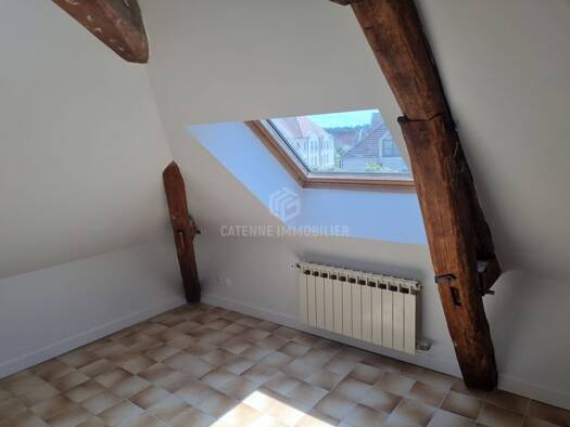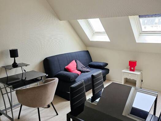 SENLIS centre ville, au 2ème étage sous combles, appartement meublé offrant pièce de vie av. poutres apparentes, cuisine américaine équipée, 1 chambre, 1 petite pièce bureau/dressing, mezzanine range...