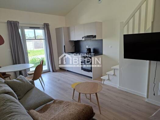 QUINSAC. Dans résidence neuve, appartement T3 MEUBLE de standing, en duplex. Pièce de vie avec cuisine ouverte aménagée et équipée, chambre, salle d'eau, wc séparé. Pièce lumineuse à l'étage de 11m² ...