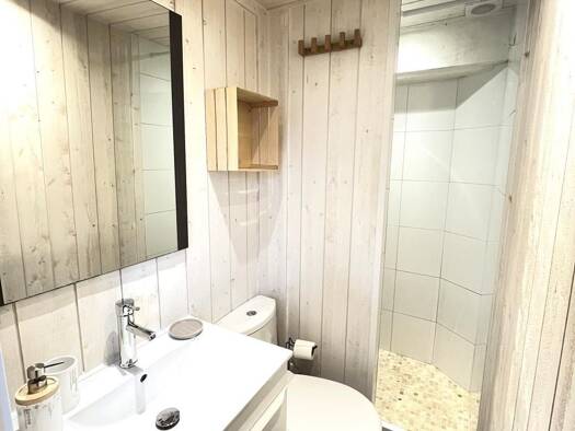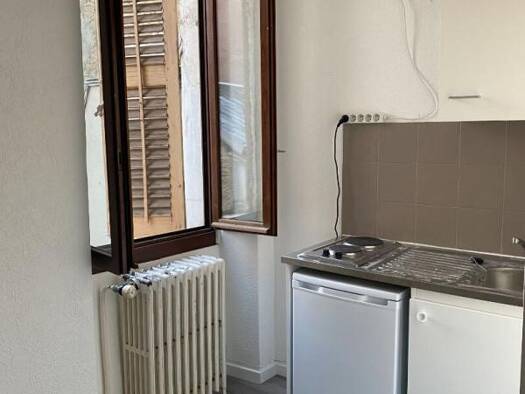 Aix-Les-Bains centre, studette meublée de 12 m² au 1e étage d'un bâtiment de 2 niveaux. Logement entièrement rénové composé d'un coin kitchenette semi équipée, salle d'eau avec WC séparé. À l'extérie...