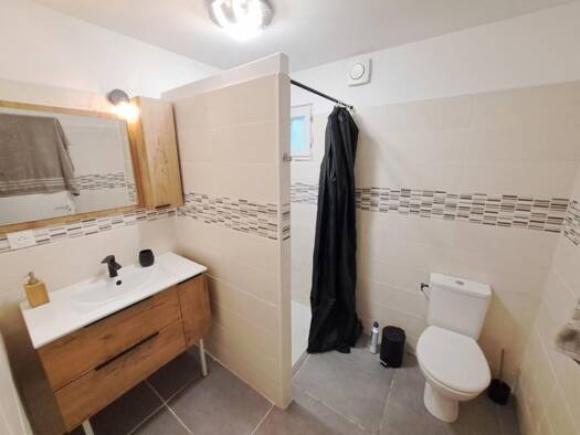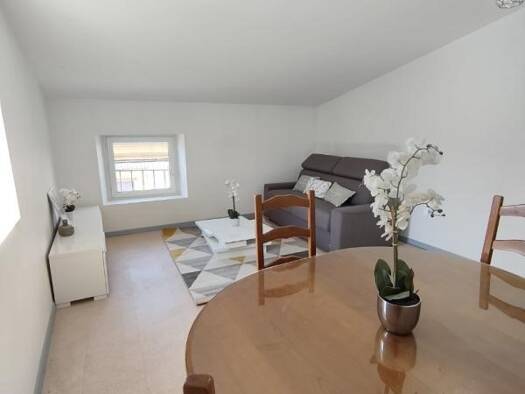 Au centre du village appartement T2 meublé, comprenant : une pièce de vie avec cheminée décorative, un coin cuisine, une grande chambre, salle de bains, wc et pièce annexe.