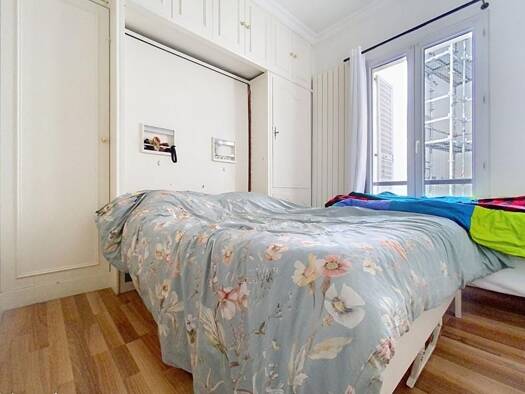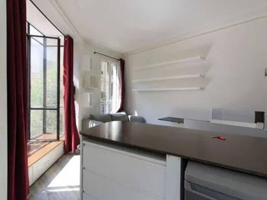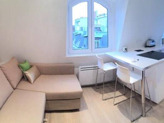 Appartement de 25 m² à Paris 75002,rue Mandar. Grande fenêtre, cuisine ouverte, canapé-lit et armoire, salle de bain avec douche à l'italienne. Idéal pour un court ou moyen séjour en couple ou en sol...