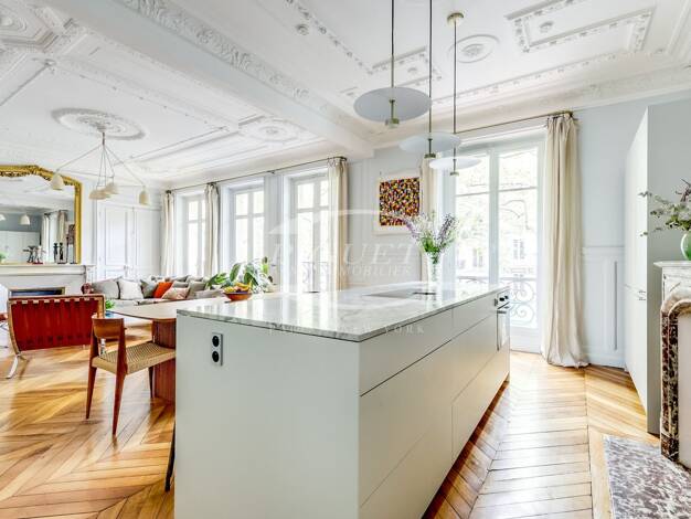 QUARTIER TRUDAINE Catherine Piguet vous invite à découvrir, à l'étage noble d'un magnifique immeuble Haussmannien un superbe appartement familial de 7 pièces entièrement rafraîchi. Les moulures prono...