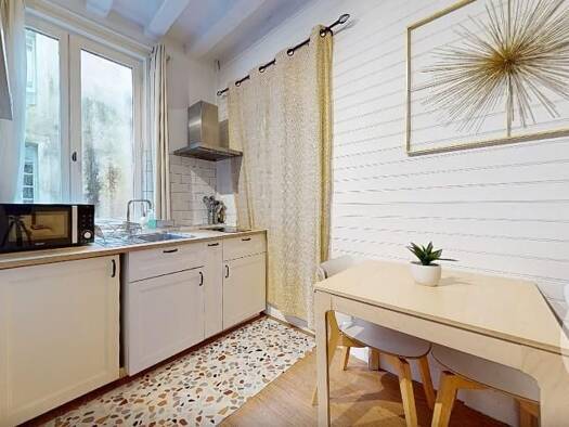 Appartement de 25 m2, en duplex, entièrement rénové, dans une petite copropriété. Au rez-de-chaussée la cuisine aménagée avec table, chaises, réfrigérateur, plaque électriques, four micro-onde, vaiss...