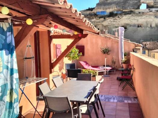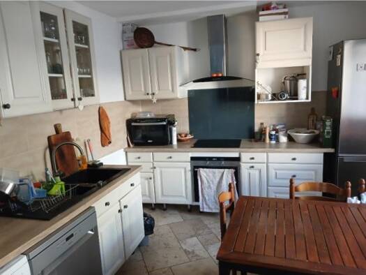 Grans, belle maison de village de 110 m² en R + 2, entièrement meublée, composée en rdc de la pièce de vie ouverte sur la cuisine équipée, wc. 1e niveau, 2 chambres, salle d'eau, 2nd niveau, tres gra...