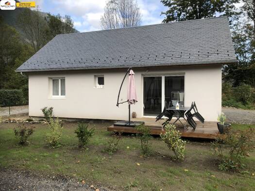 Maison de plain-pied à louer à Juzet-de-Luchon, disponible dès avril. Surface d'environ 58,42 m² avec cuisine ouverte sur séjour, deux chambres, salle d'eau, WC séparé et cellier. Terrasse, jardin et...