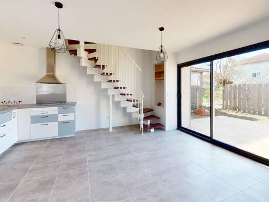 Maison plain pied de type 4 avec grande pièce de vie lumineuse, 3 chambres, jardin et garage.