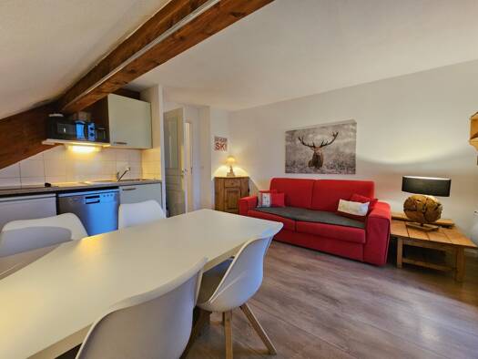 EXCLUSIVITE ! Magnifique studio restauré avec gout en 2021 aux pieds des pistes et commerces vue imprenable sur le domaine 24 m² hab comprenant salle d'eau avec wc, cuisine équipée ouverte, coin mont...