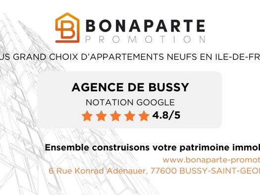 NOUVELLE OPPORTUNITE ! BONAPARTE PROMOTION A BUSSY SAINT GEORGES PROCHE TOUTES COMMODITES ET RER A PROGRAMME IMMOBILIER ELEGIBLE PRET A TAUX ZERO ! FRAIS DE NOTAIRE OFFERTS SI VOUS SOUHAITEZ DES INFO...