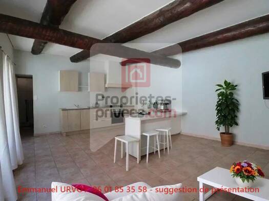 Centre village, appartement en duplex avec beaucoup de cachet . Vous profiterez d'un salon/cuisine ouverte, 2 chambres, salle d'eau et toilettes. Le plus: Cuisine neuve. Huisseries pvc double vitrage...