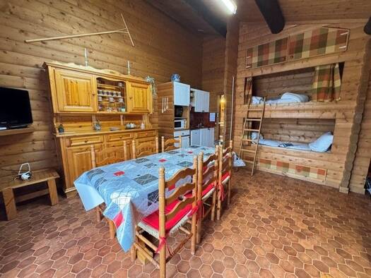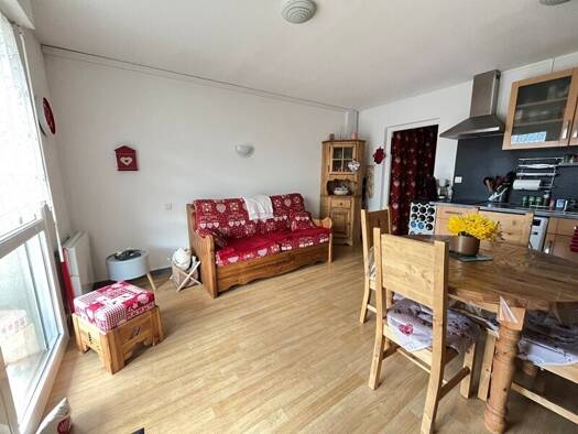 Appartement type F2 dans chalet, idéal résidence secondaire ou locatif. Appartement comprenant entrée avec dégagement et placard, chambre, coin cuisine équipée ouvert sur pièce à vivre avec accès bal...