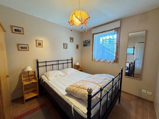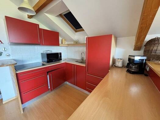Appartement type F2 plein sud avec belle vue lac. Appartement comprenant entrée avec dégagement et placards, coin cuisine équipée ouvert sur pièce à vivre avec poêle à bois et accès terrasse, chambre...