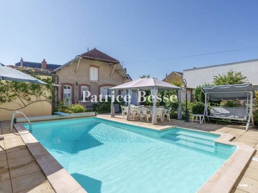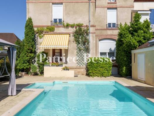 Dans la vallée de la Saône, à Auxonne, une villa d'architecte du début du 20e s., ses dépendances et sa piscine chauffée. Au débouché du portail d'entrée en fer forgé, un petit jardin sépare la maiso...