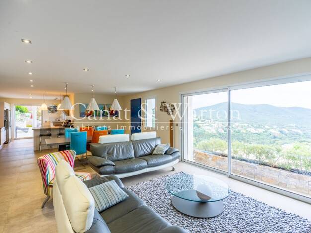 La Londe les Maures, dans un domaine sécurisé et à proximité du golf, très belle vue dégagée mer et collines pour cette villa récente de 2014 facile à vivre et aux belles prestations avec piscine cha...