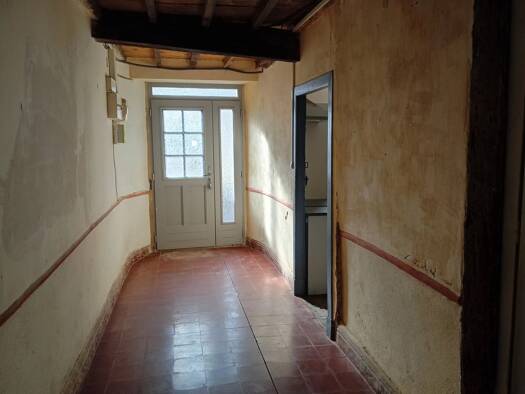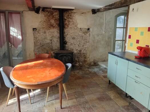 Cette maison de village se compose d'une entrée au rez-de-chaussée ,d'une grande pièce de 31 m² qui accueillait autrefois le café du village et d'une cuisine de 15 m² avec cheminée et accès a la cave...