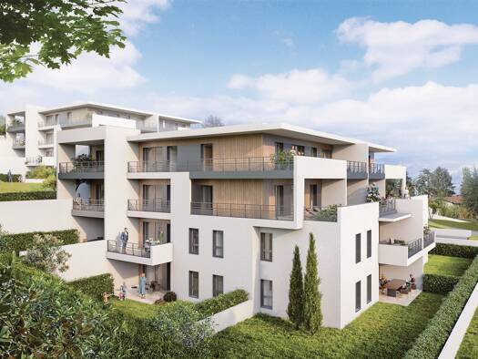 Programme neuf - Le Domaine du Joux Le Domaine du Joux , résidence de 14 logements avec jardin ou terrasse située dans un écrin de verdure avec vue dégagée, ascenseur, garages... du T2 au T5 - EXPOSI...