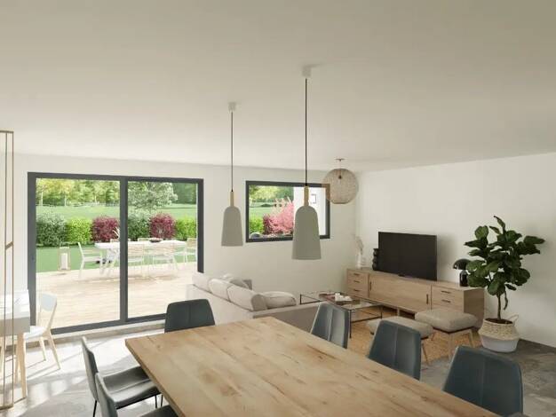 Projet de construction à Poncin – Maison de plain-pied ou à étage 3 chambres Nous vous proposons un projet de construction sur un terrain plat et viabilisé de 1 200 m² à Poncin, idéal pour profiter p...