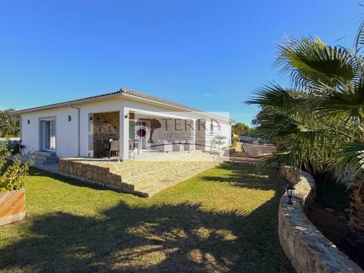 Au calme de GHISONACCIA-GARE, très jolie villa récente de 117 m2 composée d'une cuisine équipée ouverte sur bel espace de vie de 60 m2, un dégagement, 2 chambres avec placards, 1 bureau, salle d'eau,...
