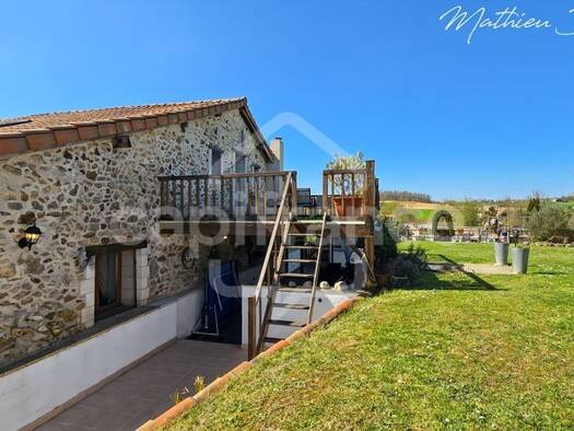 Maison de caractère de 4 chambres avec gîte (2 chambres) située dans un hameau rural à proximité du bourg de Riberac en Dordogne.La maison comprend au rez-de-chaussée un hall d'entrée donnant accès à...