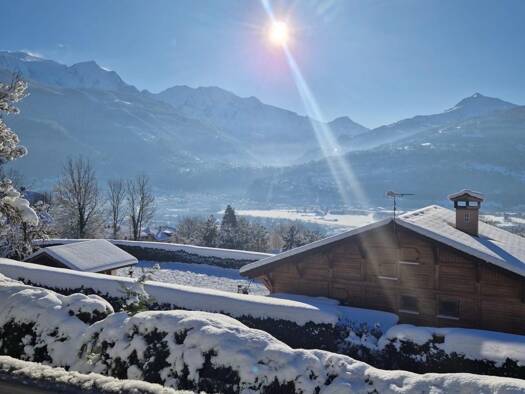 Chalet independent de 196 m² sur un terrain de 1 218 m², offrant des vues plein sud exceptionnelles sur le glacier des Bossons et le massif du Mont-Blanc.