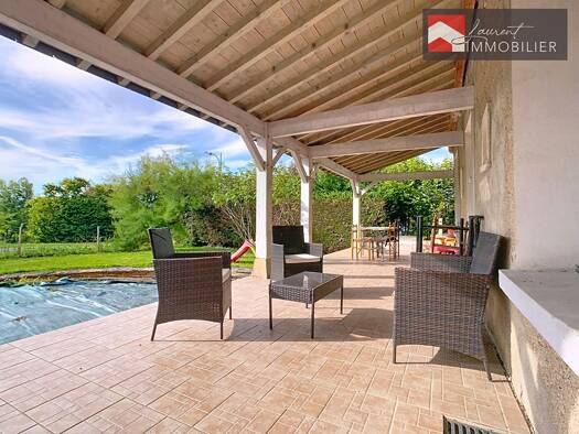 Dans joli village proche de Chalon-sur-Saône, Sur terrain 2359 m2, spacieuse propriété comprenant : Séjour avec baie donnant sur le jardin, cuisine indépendante entièrement équipée, un bureau, w.c., ...