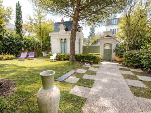 Dans une petite ville proche d'Angers, une maison du 19e s. récemment agrandie avec ses jardins et sa piscine. Une ruelle dessert la grille d'entrée de la propriété, qui ouvre sur un premier jardin. ...
