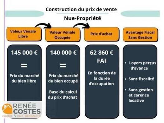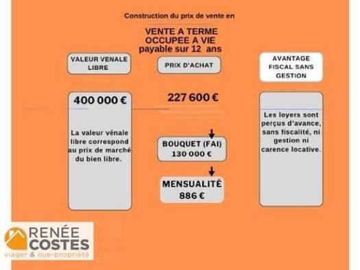 Maison - 5 pièces - 131 m² Vente en viager occupé Valeur du bien : 220 000 euros Bouquet : 65 700 euros Rente mensuelle : 411 euros Décote d'occupation : 105 000 euros soit 47,80 % Prix au m² médian ...