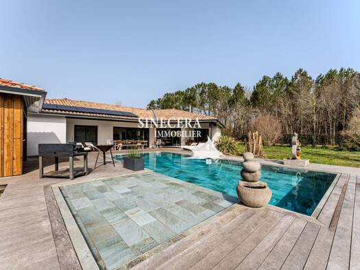 Maison à vendre à Mios. Magnifique villa de 2009, située dans le quartier de Lillet, à 2km des commerces, sur une parcelle de 3143m2. C'est une demeure haut de gamme, qui présente des prestations de ...
