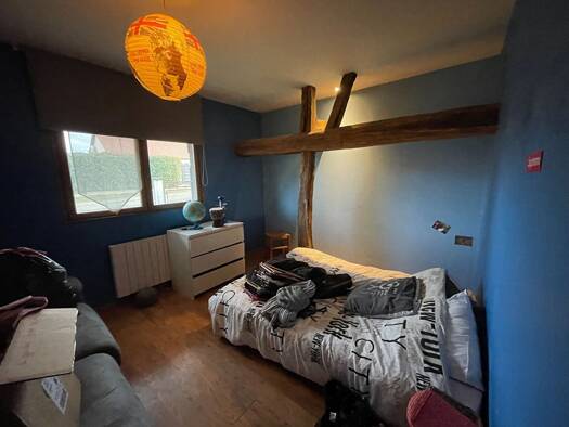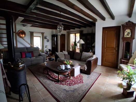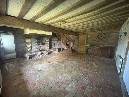 A 2 km du bourg, ferme bressane mitoyenne en briques et colombages, sur 150 m² habitable, comprenant hall d'entrée, cuisine équipée avec cellier et cheminée foyer ouvert, salon, salle à manger avec t...